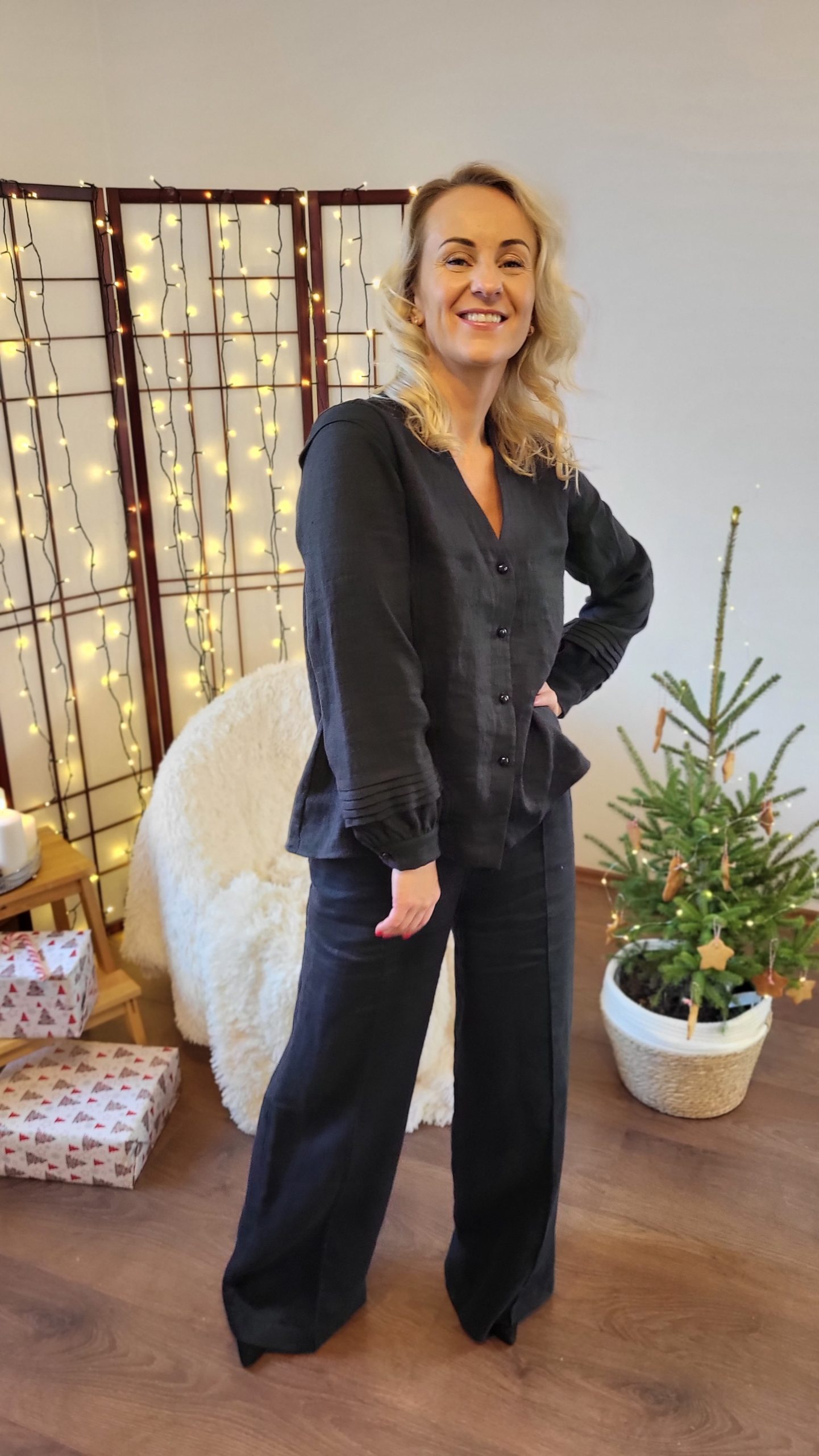 Juodos spalvos lininiai marškiniai.Laisvi ir nevaržantys judesių.Rankovės galuose yra šiek tiek išplatėjusios ir dekoruotos horizontaliomis klostelėmis. Nugaros detalė ilgesnė už priekį. Marškiniai užsegami sagomis. Apykaklė trikampė.