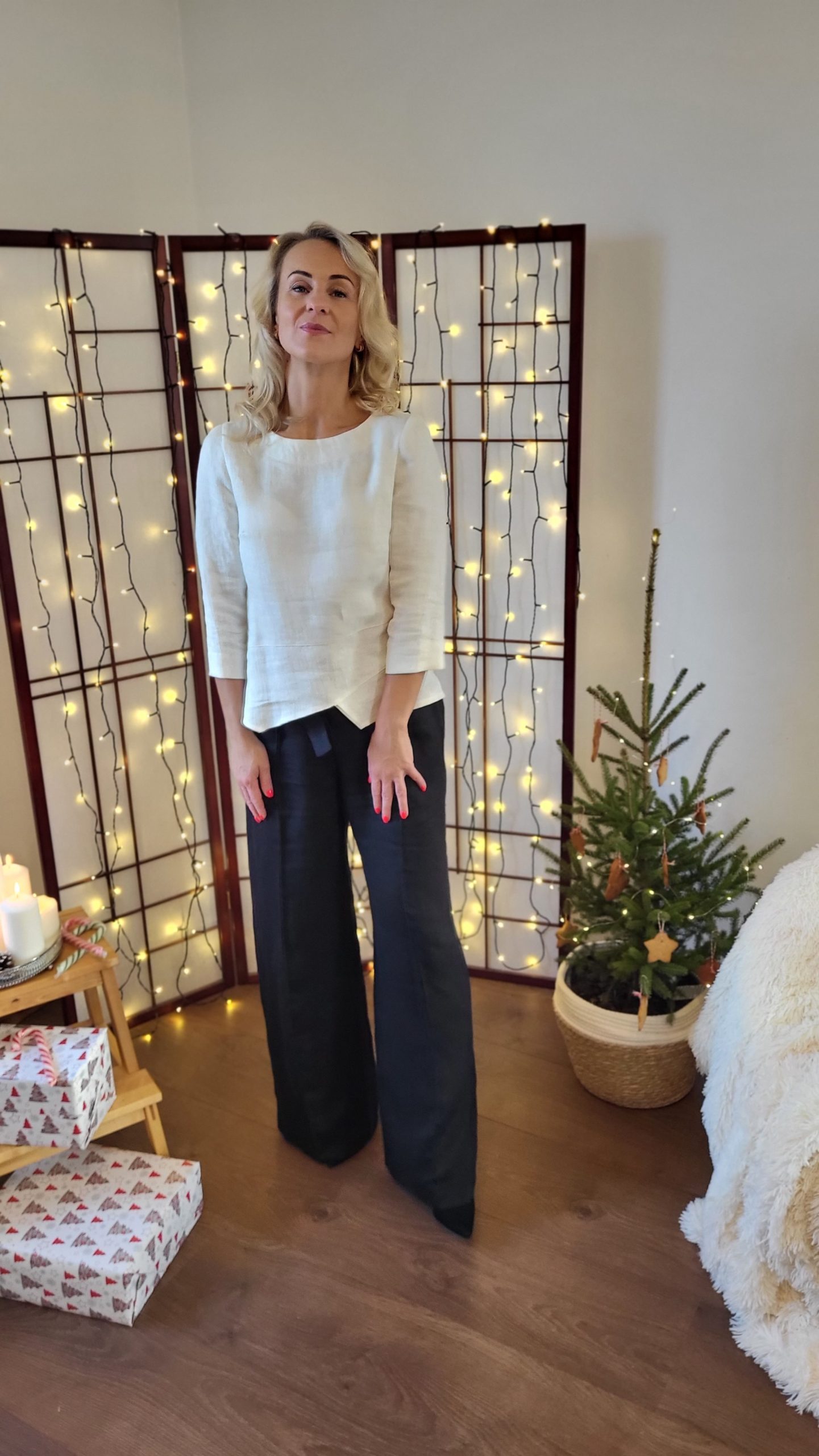 Juodos spalvos lininiai marškiniai.Laisvi ir nevaržantys judesių.Rankovės galuose yra šiek tiek išplatėjusios ir dekoruotos horizontaliomis klostelėmis. Nugaros detalė ilgesnė už priekį. Marškiniai užsegami sagomis. Apykaklė trikampė.
