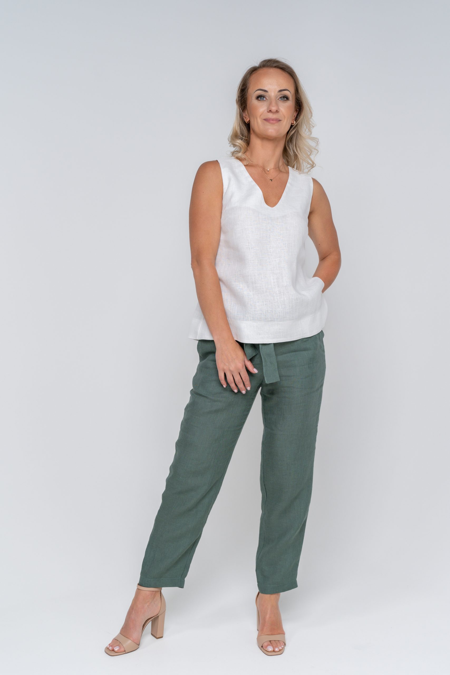 Palaidinė, tinkanti prie visko. Be rankovių, su V formos apykakle priekyje, laisvo silueto, pasiūta iš balto lininio audinio. Šią palaidinę puikiai priderinsite prie kelnių, šortų ar sijonų.
