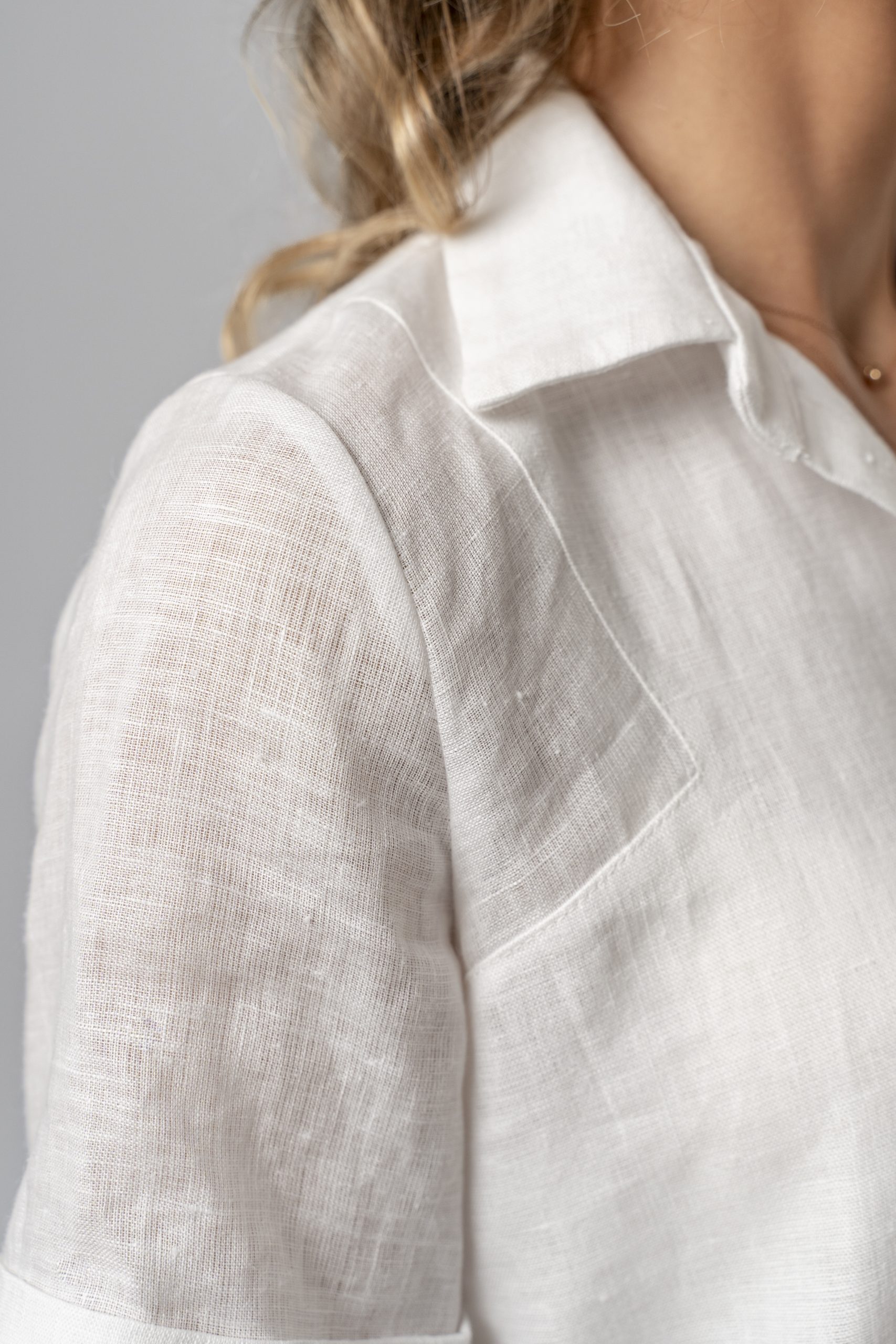 Elegantiški, laisvo silueto marškiniai trumpomis rankovėmis, klasikine apykakle, šonuose skeltukai. Priekis yra trumpesnis už nugaros detalę.