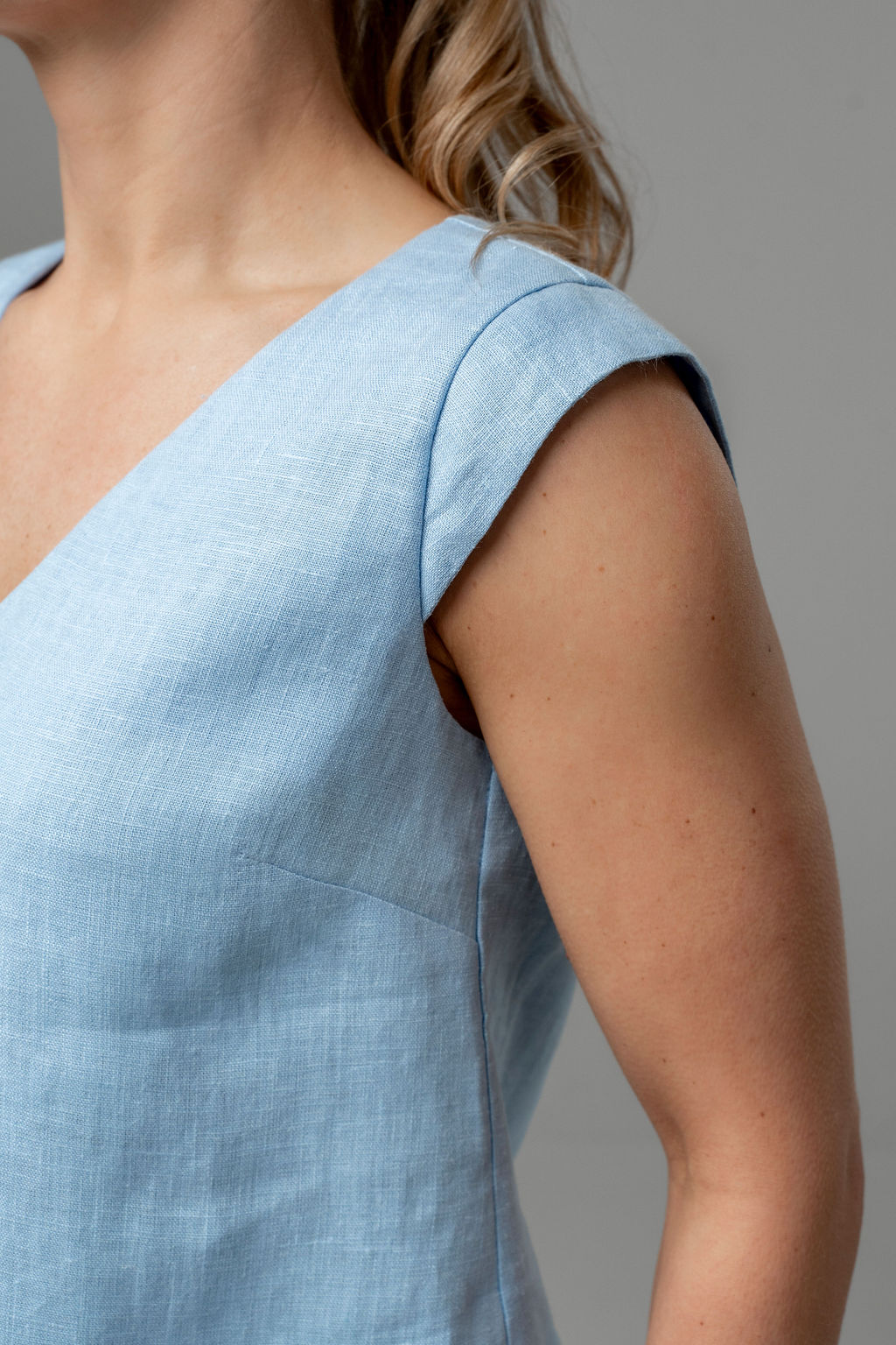 Žydros spalvos lininė palaidinė su V formos iškirpte ir dekoratyvinėmis klostelėmis apačioje. Laisvo silueto modelis užtikrina lengvumą karštą vasaros dieną. Tinkanti derinti prie visko: kelnių, sijono, šortų ar po švarku.