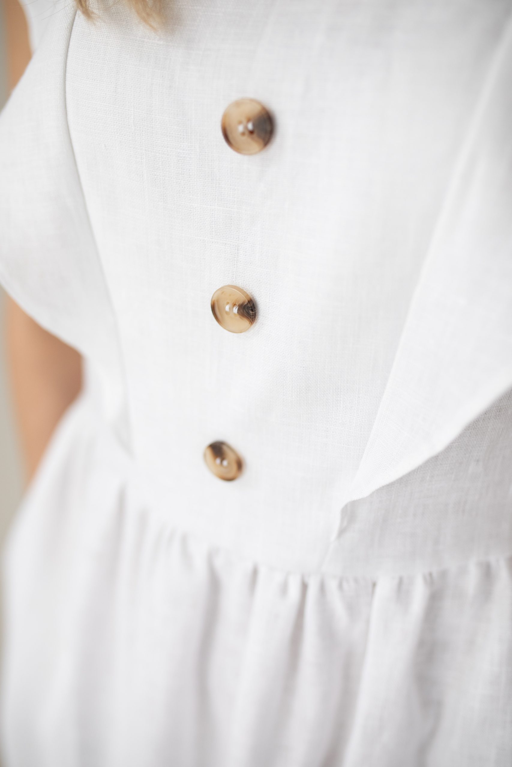 Midi suknelė pavadinta „ANGEL” yra balto lino. Ši suknelė turi žaismingas rankoves, parauktą sijoną ir priekį dekoruotą sagutėmis. Suknelės viršus yra prigludęs ir užsegamas užtrauktuku. Šoninėse siūlėse yra kišenės.