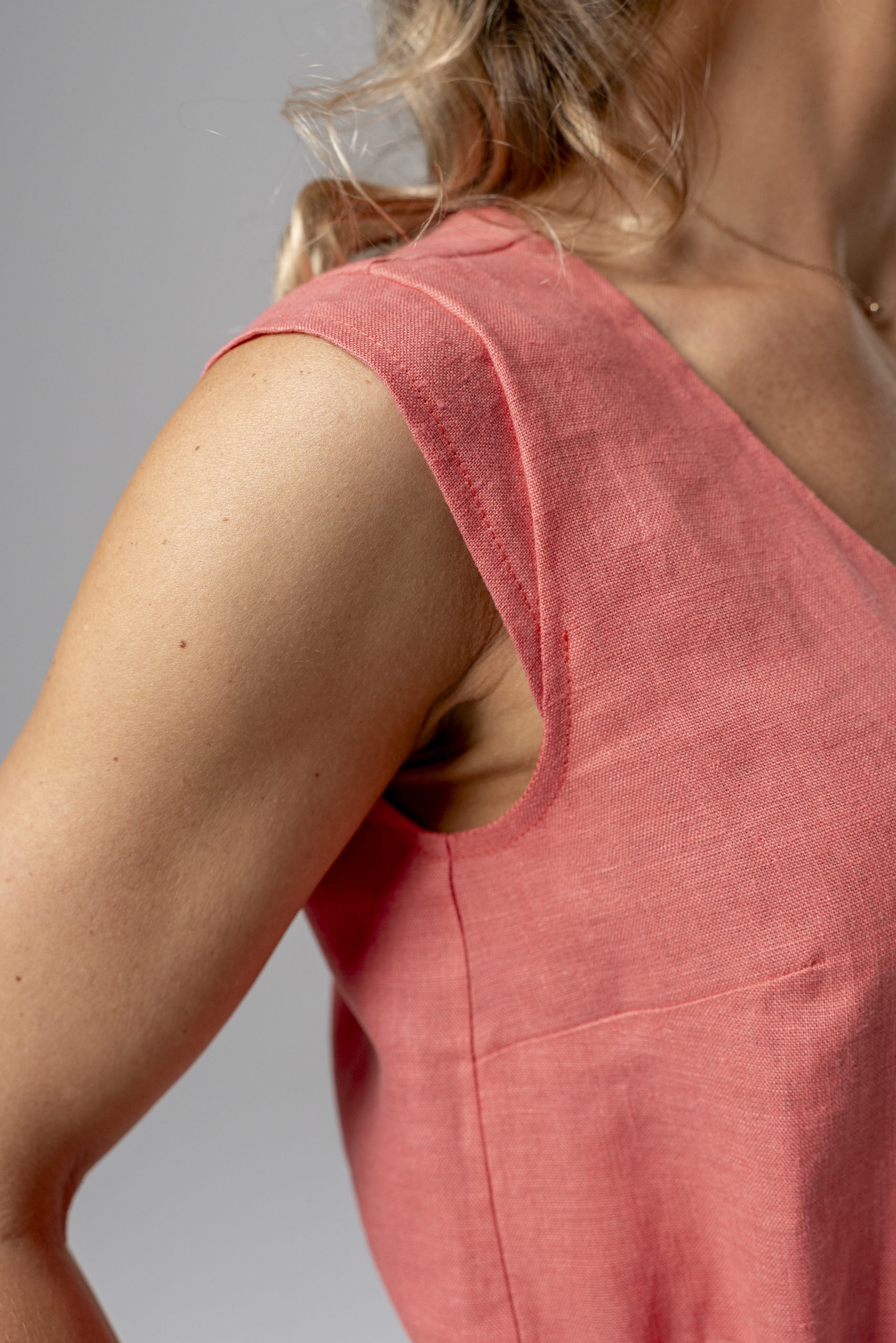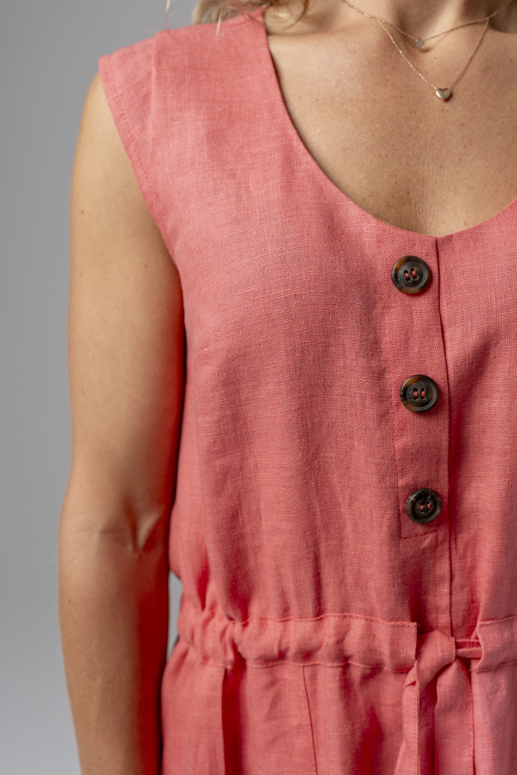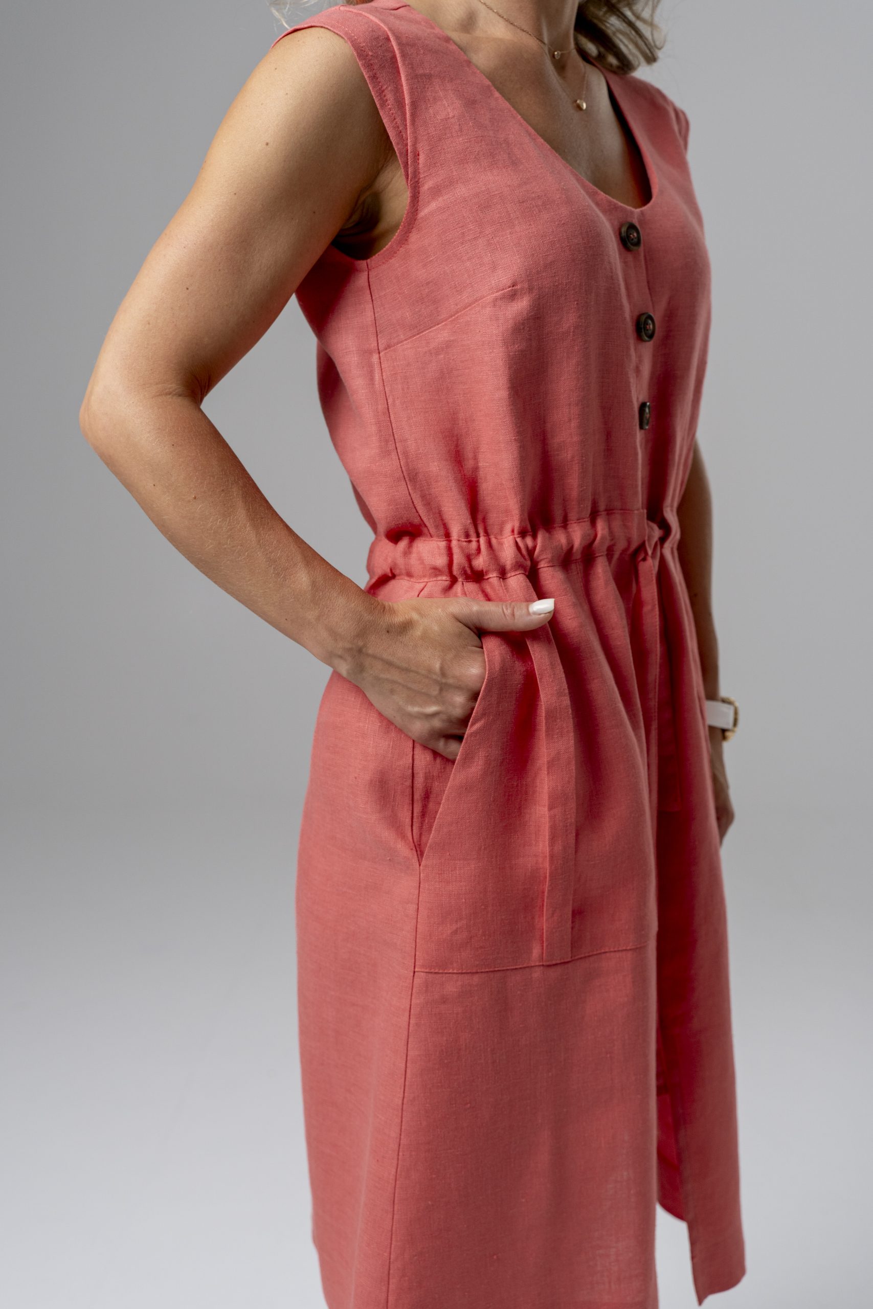 Koralų spalvos, laisvo silueto suknelė. Juosmuo reguliuojamas dirželiu, o priekis dekoruotas sagomis ir uždėtinėmis kišenėmis. Suknelės priekyje negilus skeltukas.